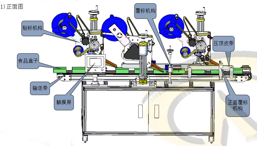 人工把食品盒子放到貼標機輸送帶上即可,機器自動完成食品盒子的輸送,導正,定位,貼標,覆標動作,人工再把成品取下。