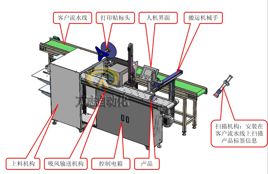 3.掃描槍掃描信息并傳回電腦,打印機打印標(biāo)簽,吸頭吸取標(biāo)簽;傳感器檢測到產(chǎn)品到達貼標(biāo)位,貼標(biāo)機械手進行貼標(biāo)